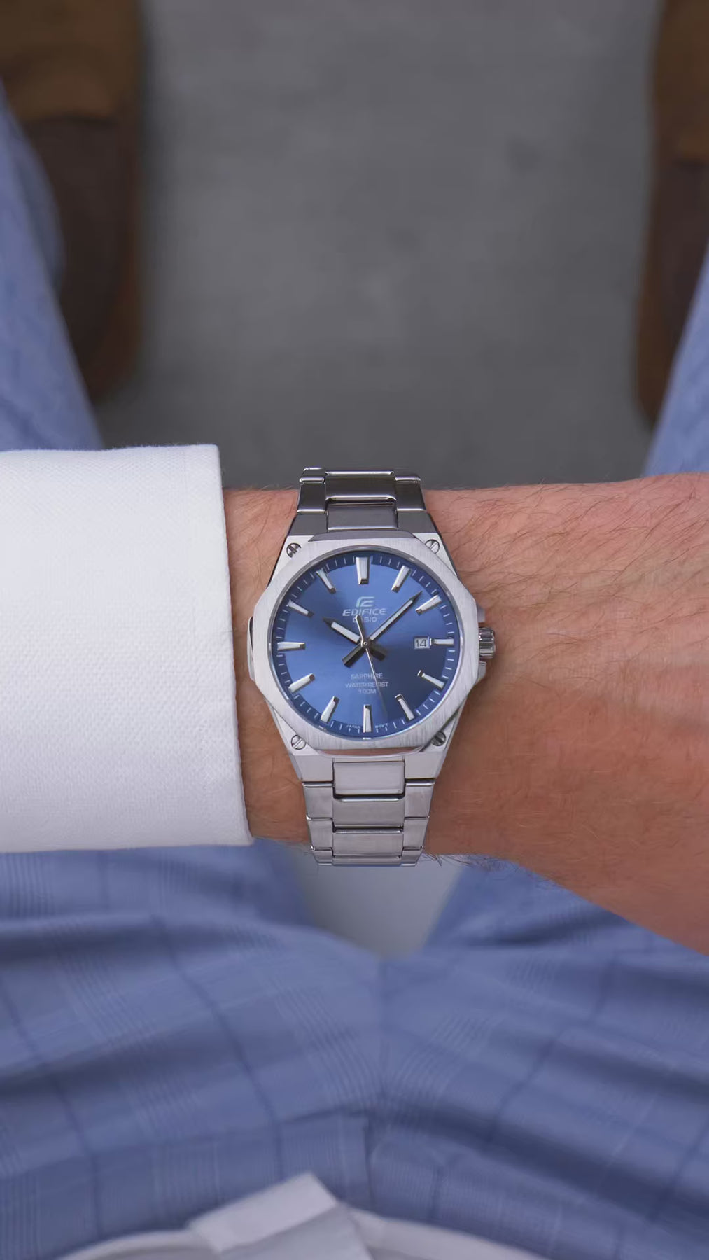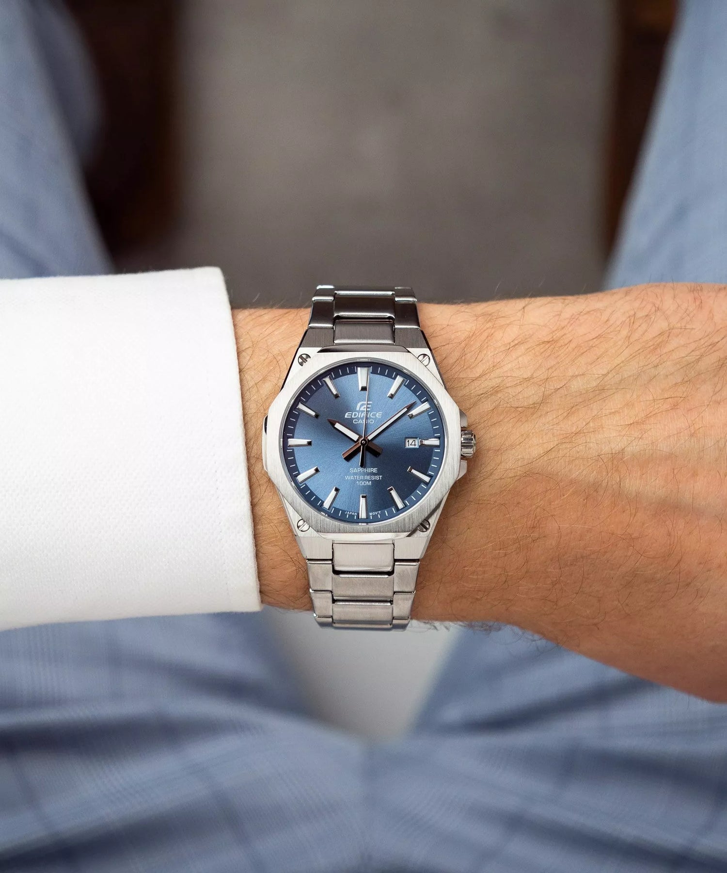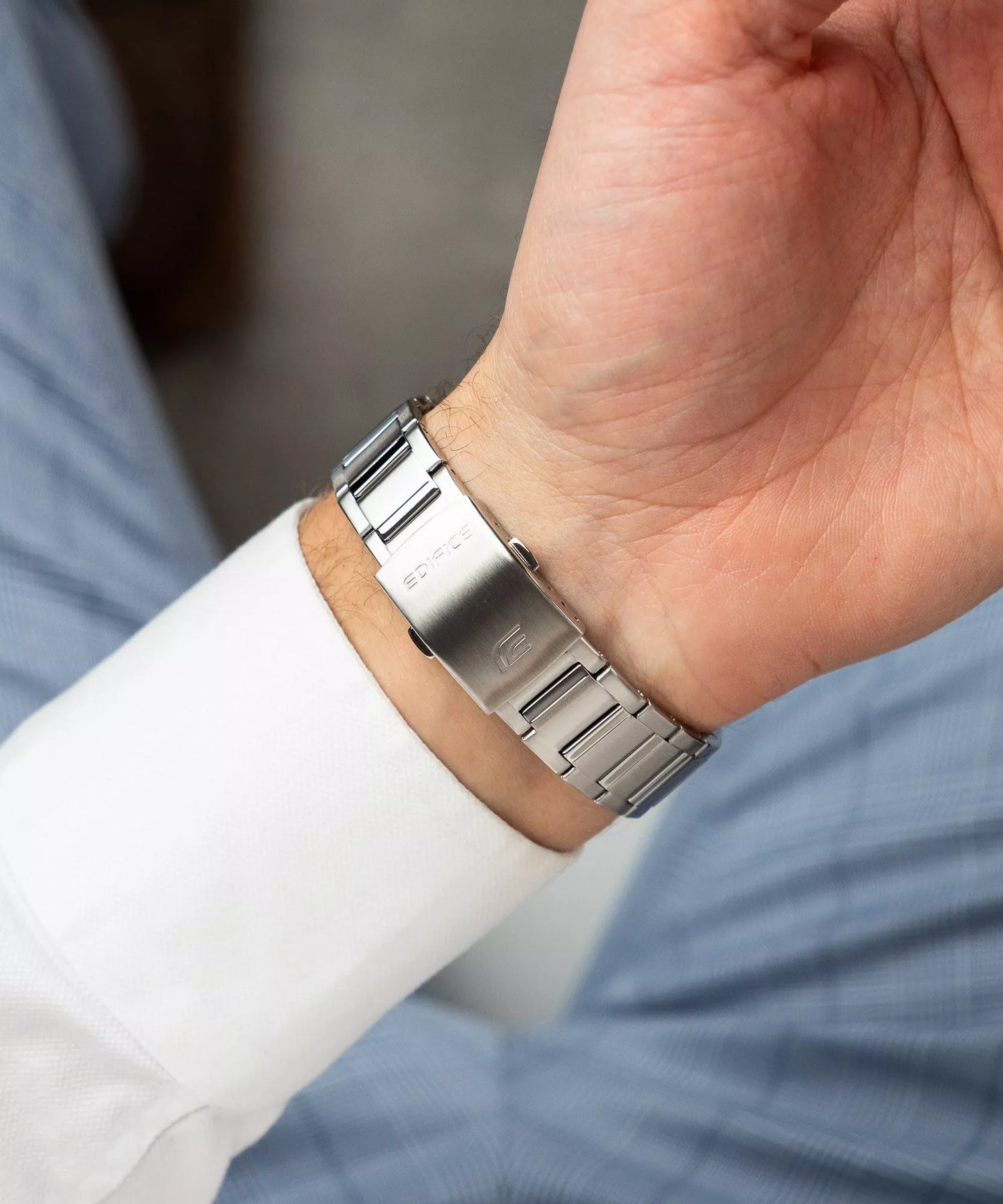 La caja de acero inoxidable presenta un diseño octogonal inspirado en la alta relojería, con acabado cepillado que minimiza rayones y huellas dactilares. Los tornillos decorativos en las esquinas añaden un toque industrial-deportivo que define la identidad de la línea Edifice. El brazalete integrado de acero con eslabones sólidos garantiza durabilidad y comodidad durante todo el día.