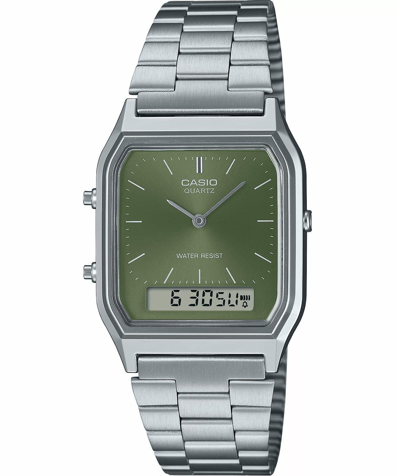 Reloj Casio AQ-230A-3A Plateado — Ana-Digi Vintage Esfera Verde Olivo