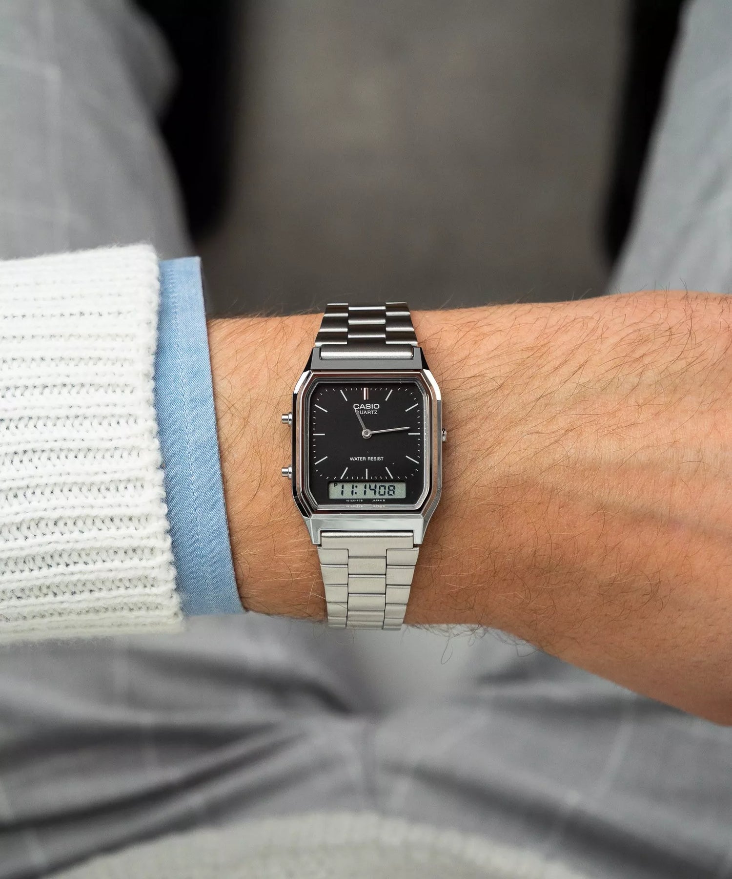 La serie AQ-230 representa uno de los renacimientos más exitosos de Casio. Lejos del minimalismo excesivo moderno, este reloj celebra el diseño funcional de los años 80. La versión con esfera negra crea un contraste impecable con la caja plateada, logrando una declaración de estilo individual que combina la fiabilidad inquebrantable de la marca con un formato atemporal.