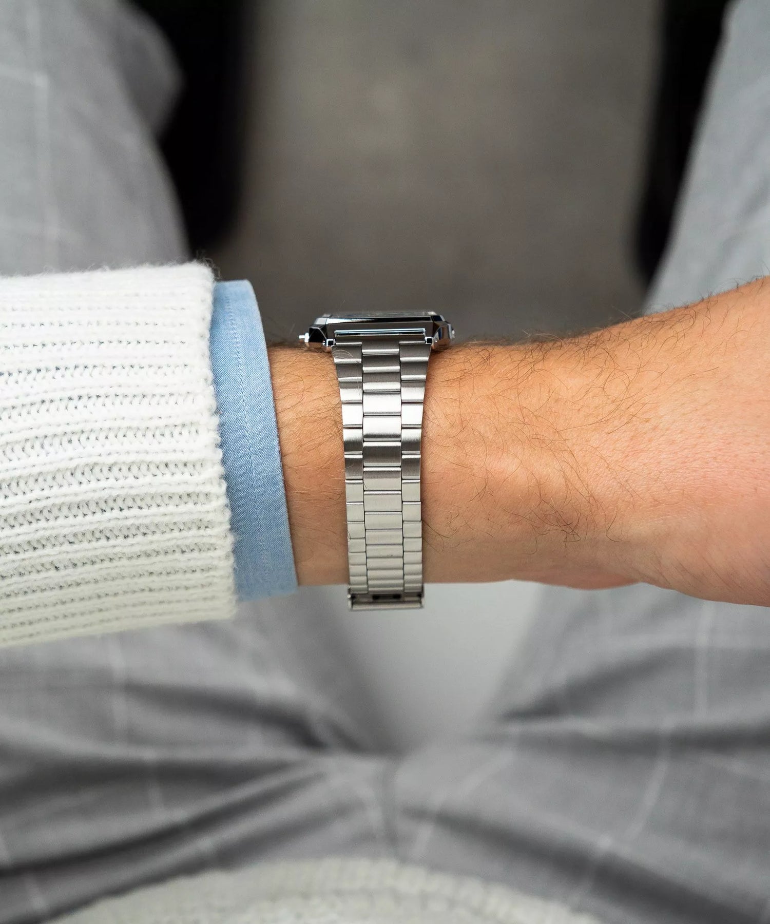 La correa de acero inoxidable cuenta con un acabado pulido brillante, cierre desplegable seguro y un diseño articulado que proporciona flexibilidad y comodidad superior.