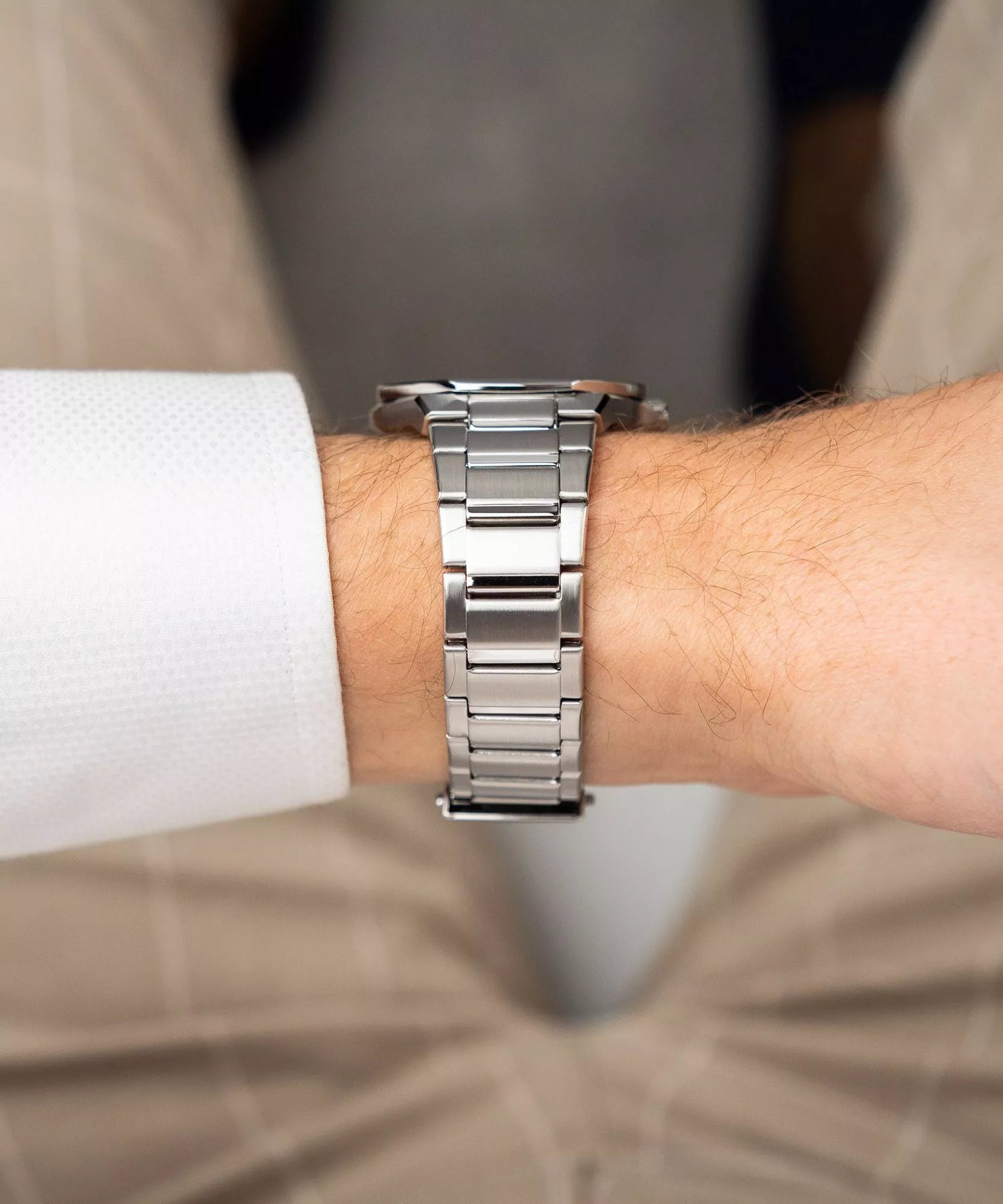 Un diseño ergonómico y sorprendentemente delgado que se desliza sin esfuerzo bajo el puño de cualquier camisa de vestir o saco.