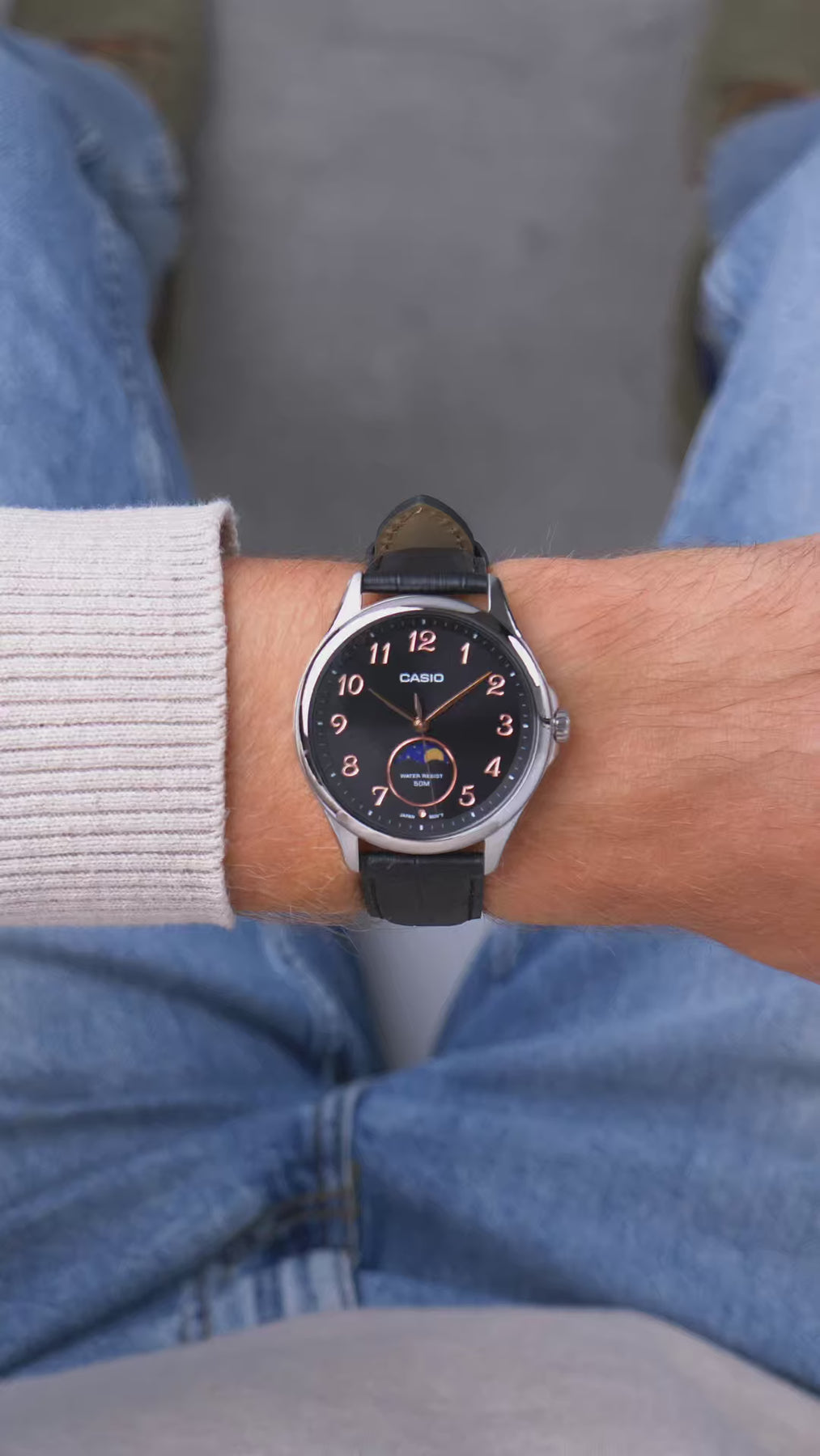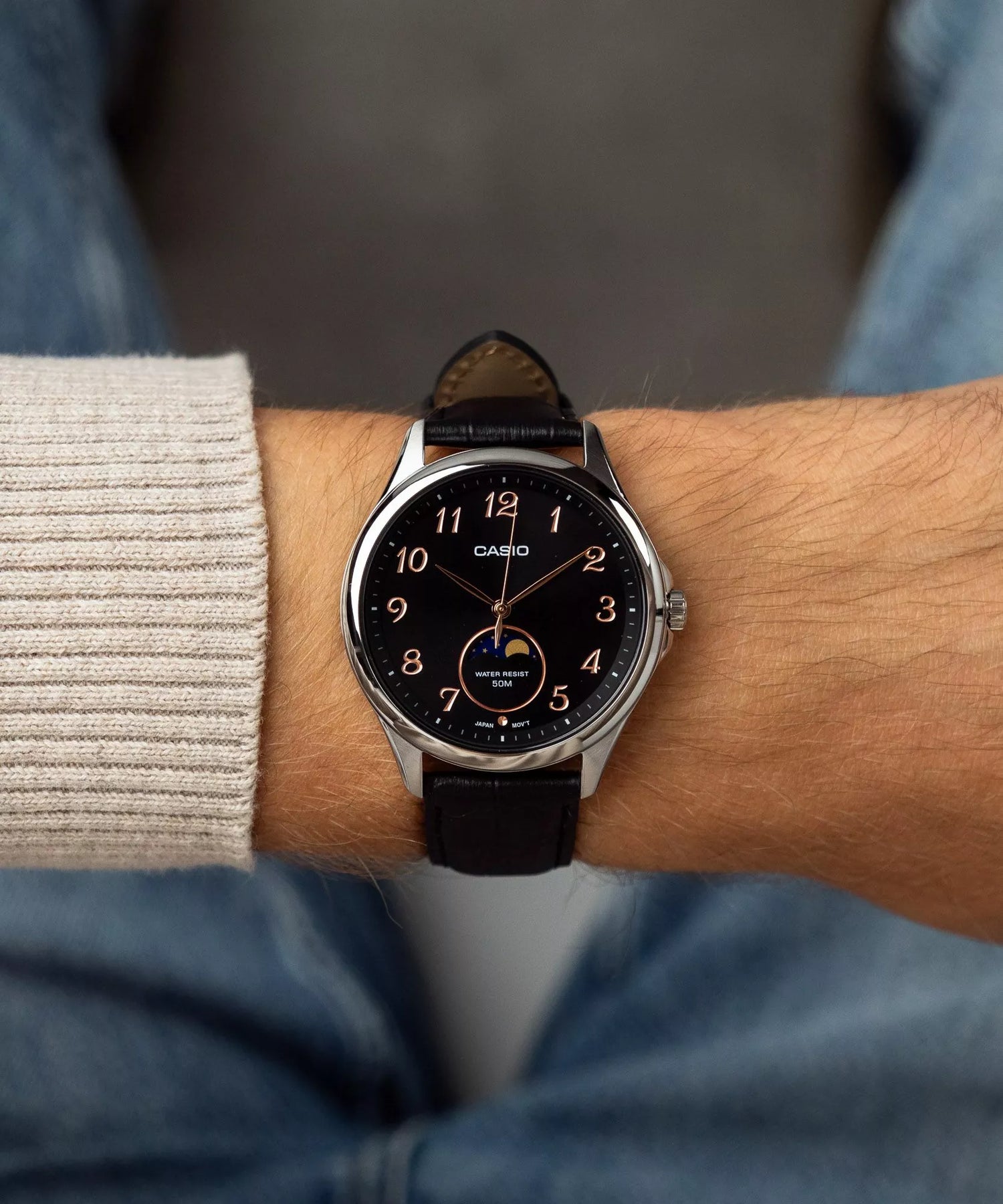 El Casio MTP-M110L-1AER es la variante mas sofisticada y personal de la nueva serie MTP-M110: mantiene la misma complicacion de fase lunar del modelo en acero, pero la envuelve en una combinacion cromatica de mayor distincion — esfera negra con agujas y detalles en oro rosa sobre caja de acero plateado y correa de cuero genuino negro. El resultado es un reloj de vestir con caracter propio, donde la calidez del oro rosa contrasta con el negro intenso de la esfera y el cuero en una armonia visual que recuerda a los grandes relojes dress de las maisons suizas, pero con la precision, fiabilidad y accesibilidad que solo Casio puede ofrecer. Disponible en precio en soles, con envío gratis y pago contra entrega en Lima y provincias.