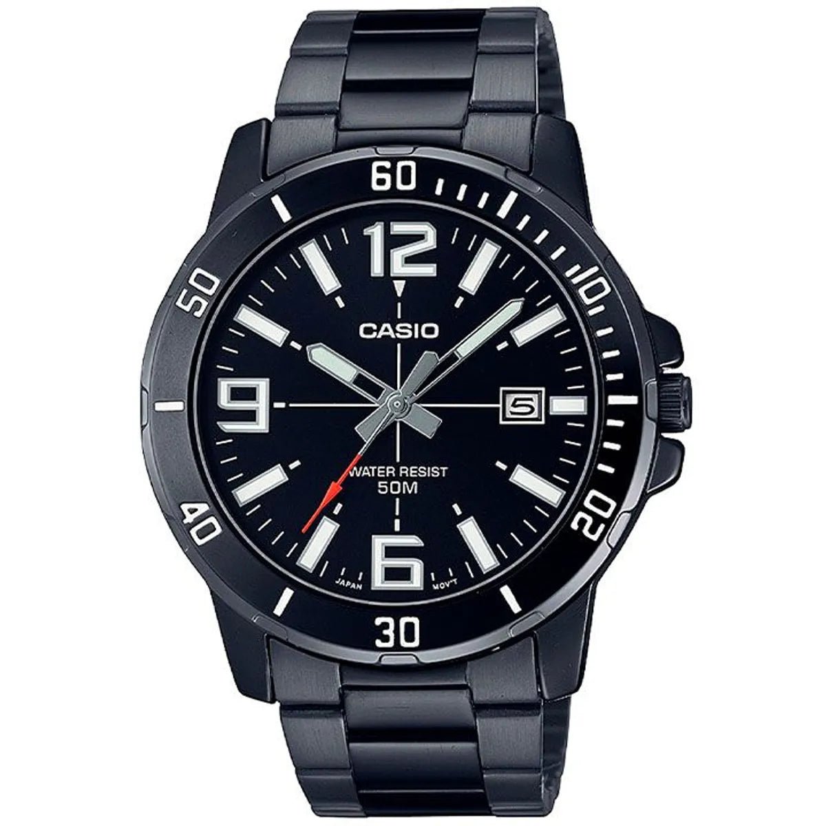 El Casio MTP-VD01B es un reloj de hombre con carácter: caja y brazalete de acero inoxidable con baño de iones negros que le dan un acabado oscuro, uniforme y de alto impacto visual. Diseño inspirado en relojes de buceo, con esfera negra, índices luminiscentes y bisel horario — toda la actitud de un diver a un precio imbatible.
