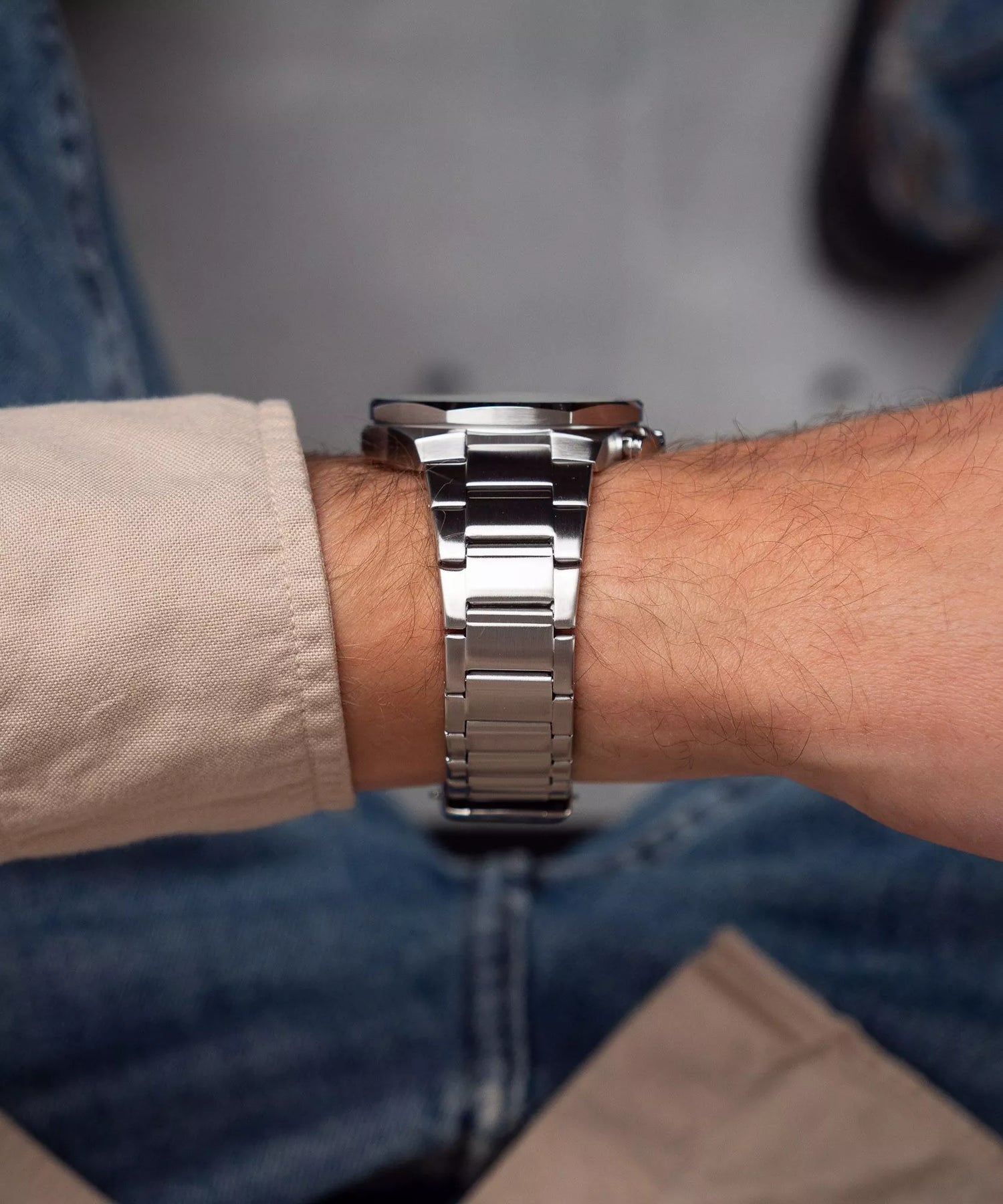 La caja del reloj está fabricada completamente en acero inoxidable sólido, proporcionando un peso agradable y una presencia de gama alta.