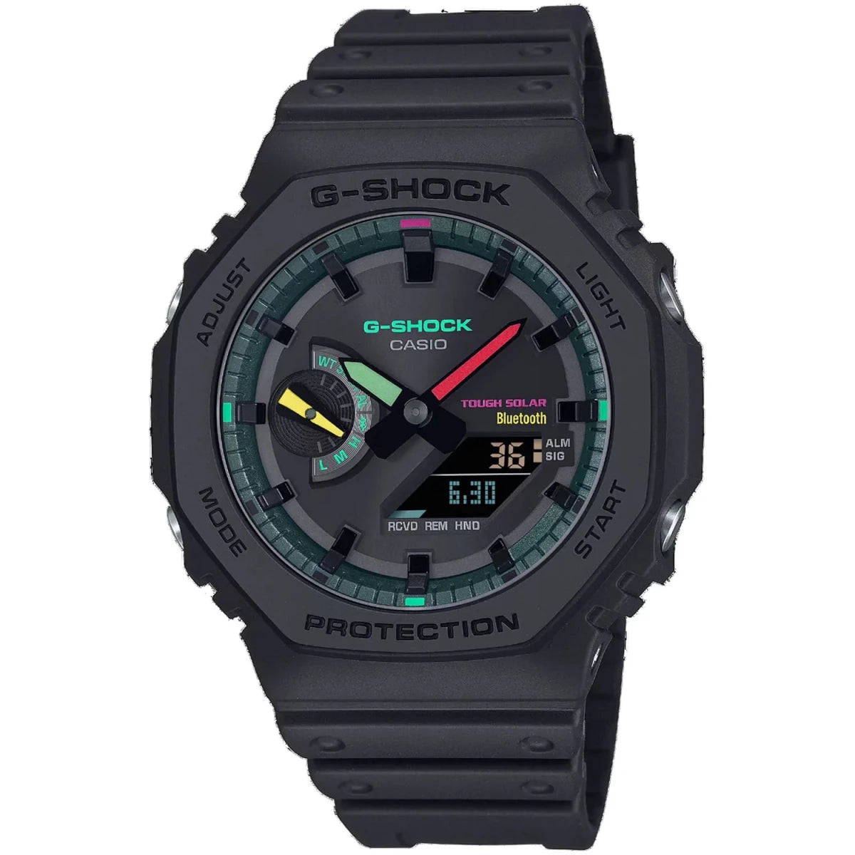 El Casio G-Shock GA-B2100MF-1AER es la versión "Multi Fluorescent Accents" de la icónica serie octogonal GA-2100 — un reloj negro que rompe el juego con detalles fluorescentes en azul, rosa y amarillo sobre manecillas, marcadores y esfera. Diseñado para quienes no eligen entre estilo urbano y rendimiento extremo.