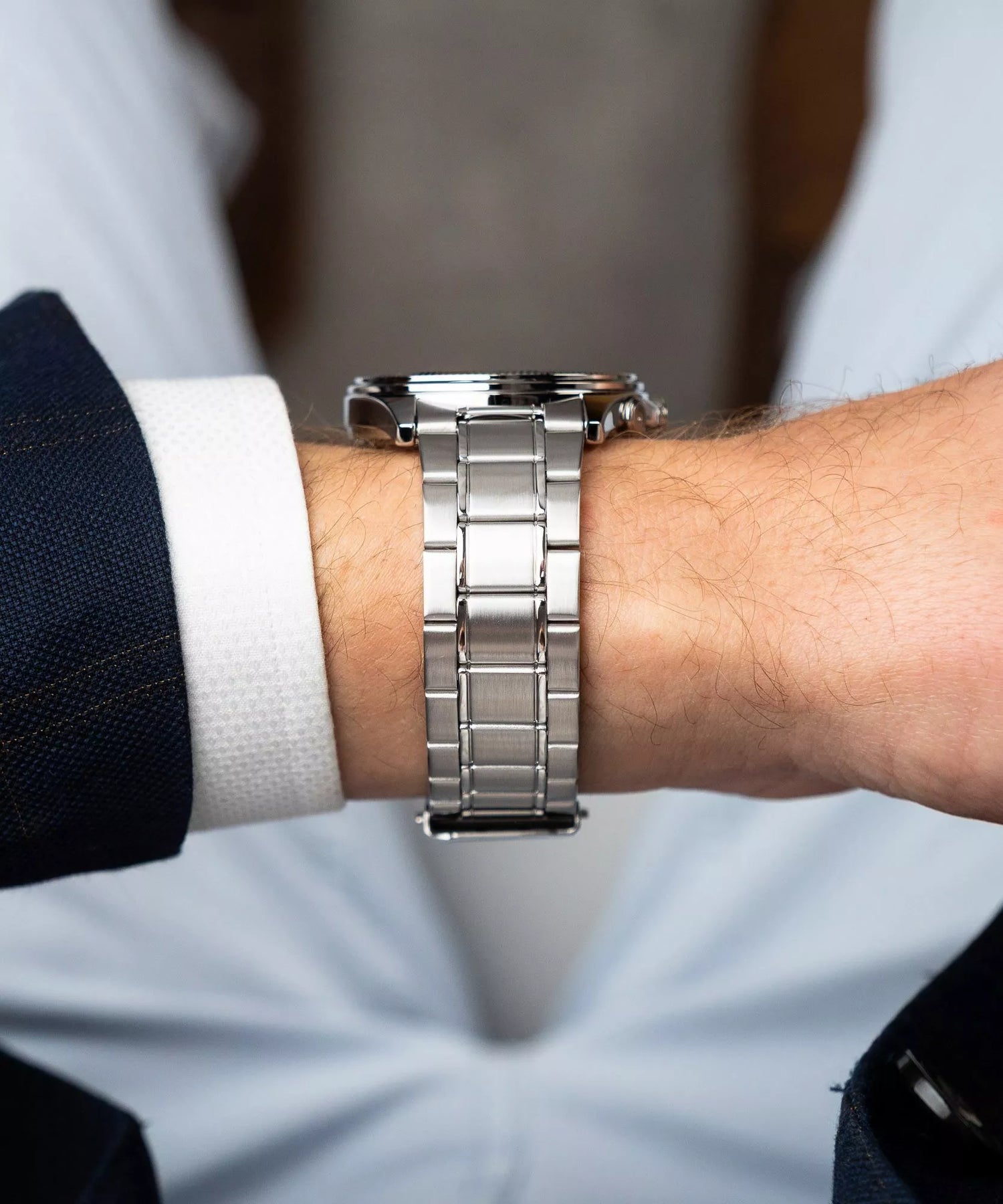 Banda de acero resistente con un peso de 124g que transmite calidad, durabilidad y presencia en la muñeca.