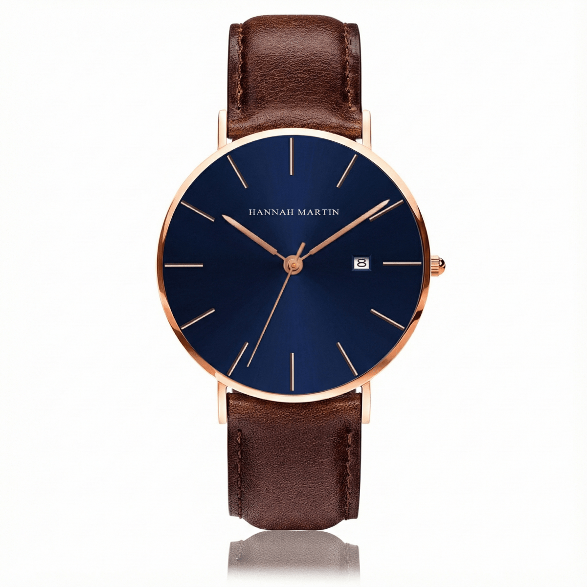 El Reloj Hannah Martin Azul Marino con Oro Rosa representa la esencia del diseño minimalista escandinavo accesible. Este elegante timepiece combina una esfera azul profundo con índices y agujas en oro rosa/oro champagne, caja ultra-delgada en acabado rose gold, correa de cuero genuino marrón chocolate y funcionalidad de fecha discreta, creando un reloj de vestir versátil y contemporáneo que funciona tanto en contextos formales como casuales a un precio excepcional.